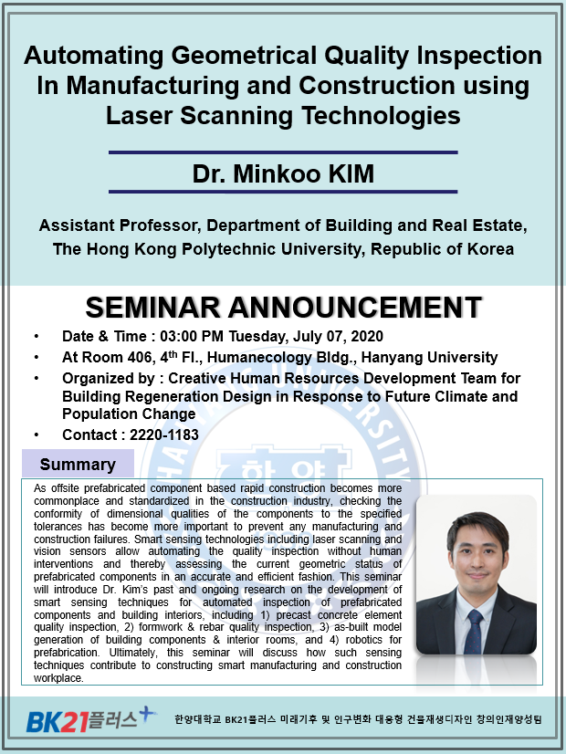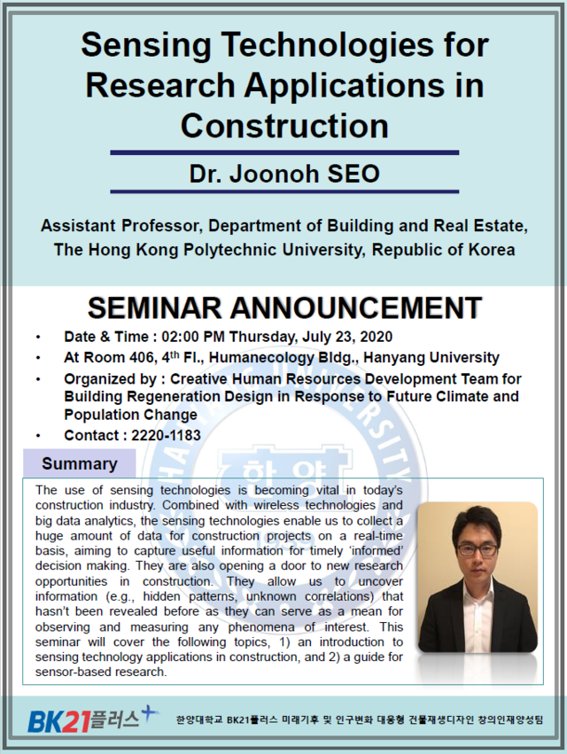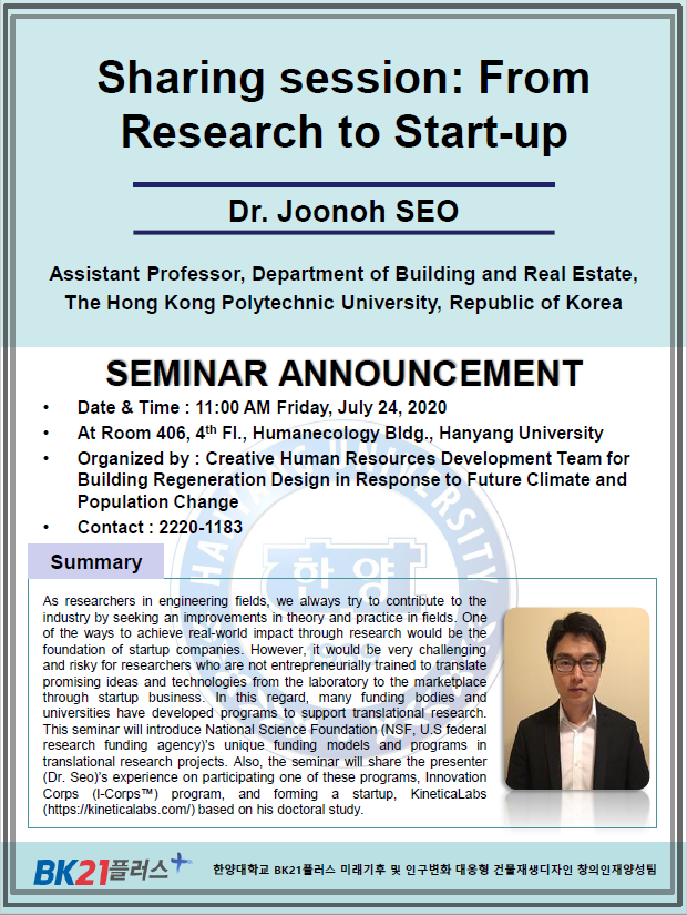 HYID BK21Plus Seminar “Sharing session: From Research to Start-up" will be held in Room 406, Humanecology Bldg., Hanyang University at 11 am on July 24, 2020. Dr. SEO Joonoh, Assistant professor, Department of Building and Real Estate, The Hong Kong Polytechnic University, will share the presenter (Dr. Seo)'s experience on participating National Science Foundation (NSF, U.S. federal research funding agency) program, Innovation Corps program, and forming a startup, KineticaLabs based on his doctoral study.